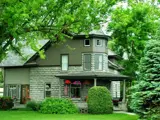 Built in 1905, the Halbert Fletcher Neal House at 101 West Pine Avenue was in what was known then as the suburbs. It is a two-story building, rectangular in shape, and constructed of cast stone or concrete blocks up to the eaves line, with shaped shingle work that covered the surfaces of the upper wall. A corner turret and hipped roof with flared eaves and double-hung sash windows recall the Queen Anne style, while the entryway’s corner position and turret evoke the earlier Victorian era. Halbert Fletcher Neal and Grace Andrews were married in 1904 and moved from Indianola, Nebraska, to Meridian in 1905. They set up one of Idaho’s first pharmacies and drugstores, with Grace as pharmacist. However, within a year, they abandoned the pharmacy, and Dr. Neal devoted himself full time to his country practice. He was Meridian’s only resident physician for 28 years, was a charter member of the Meridian Masonic Lodge, and helped build the Methodist church. He also served on the school board and city council.