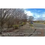 The following images are examples of pathways and public spaces that may be appropriate in mixed use areas. These are organized by interconnected nodes and links. Nodes are often places of respite or of focal activity, and activated with amenities that usually include constructed hardscape or play elements. Links are features such as pathways or linear spaces connecting nodes, usually visibly, and in a meaningful and interrelated context.